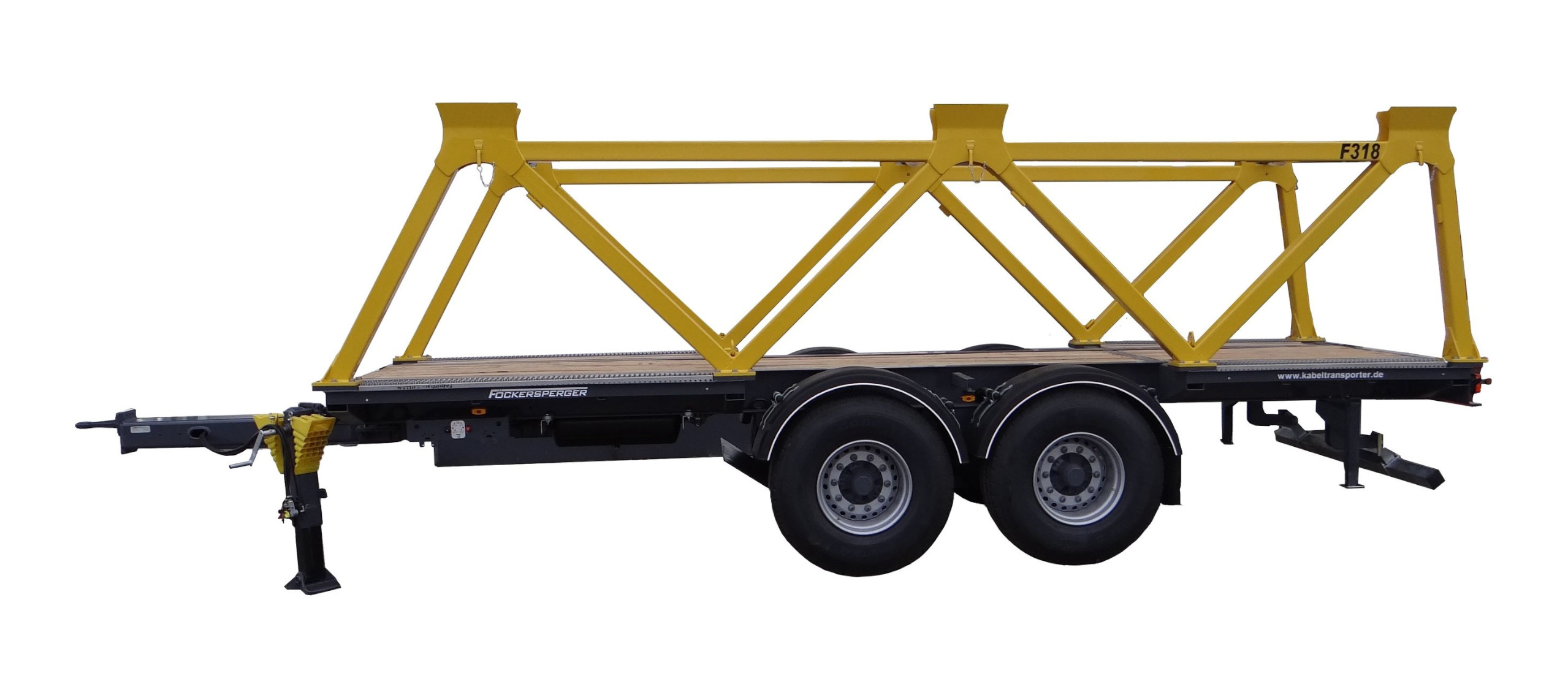 Trailer for transporting up to three cable drums with a diameter of 2.80 m and a width of 2.00 m max.